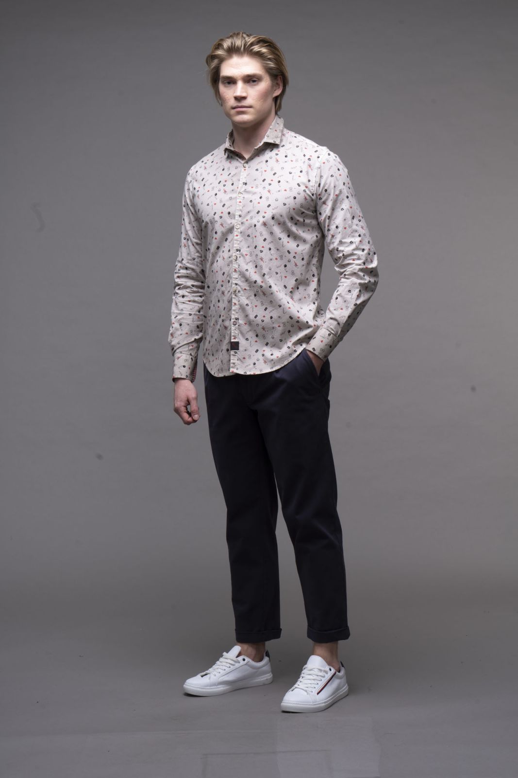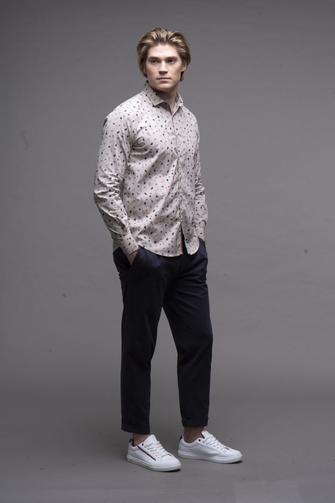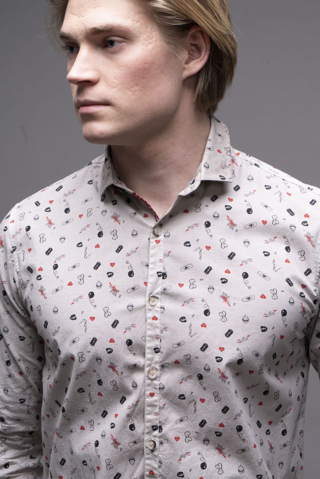 Camicia in cotone elasticizzato, 98%CO 2%EA, tintura a freddo, stampa tatoo con microdisegni, moschina KOON. 100% Made in Italy