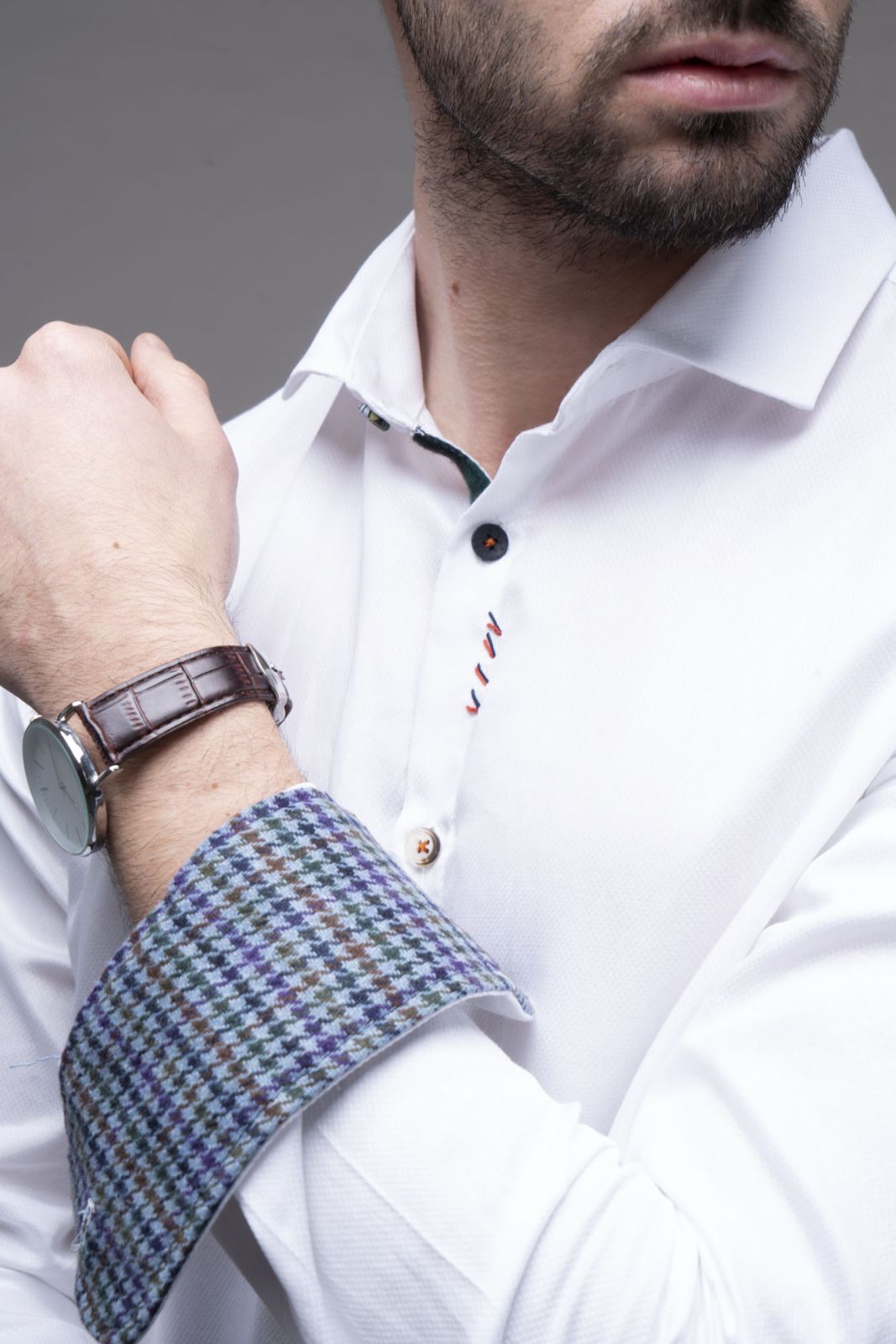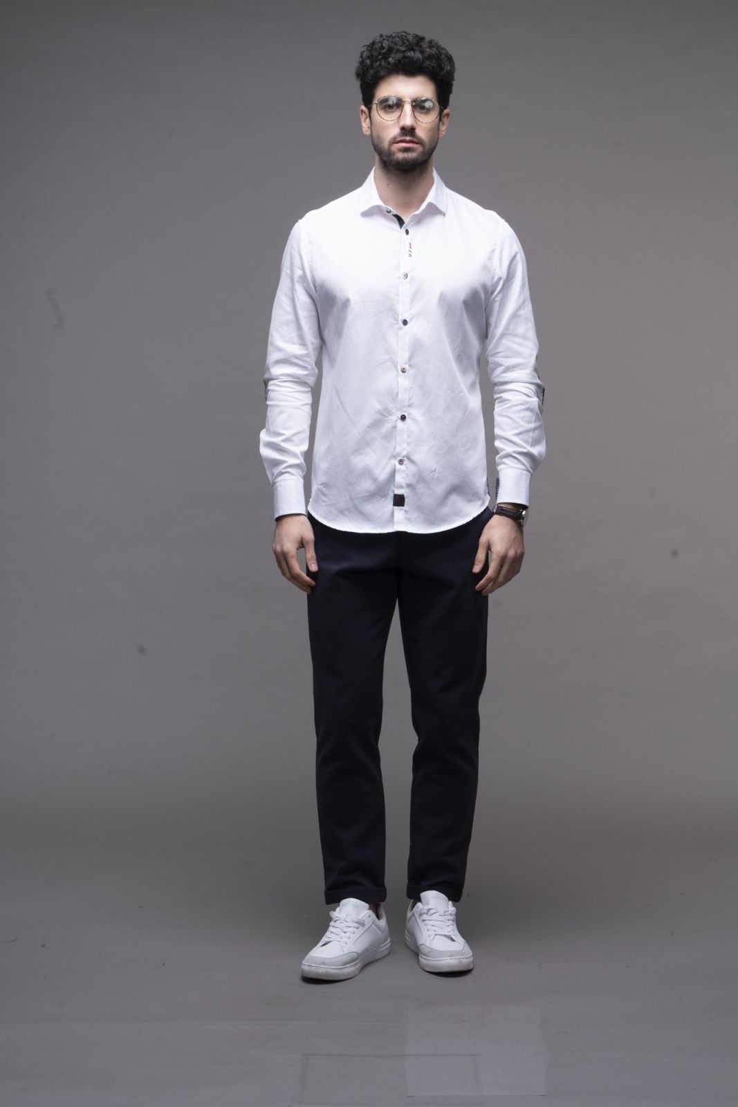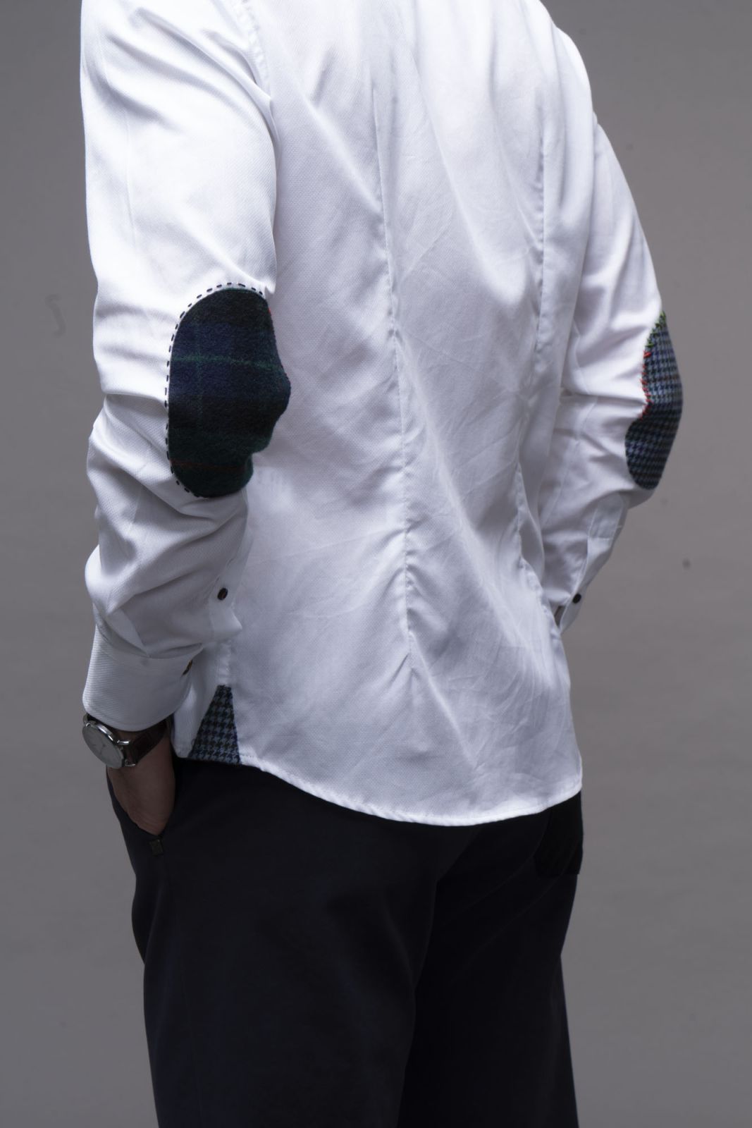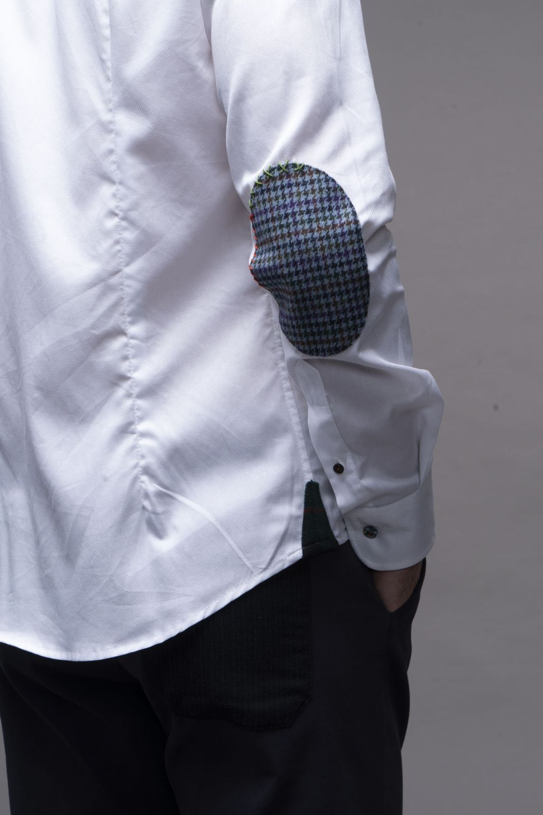 Camicia 100% cotone, bottoni multicolor, polsini e filetto a contrasto, ricamo a mano, toppe e inserti, moschina KOON. 100% Made in Italy.