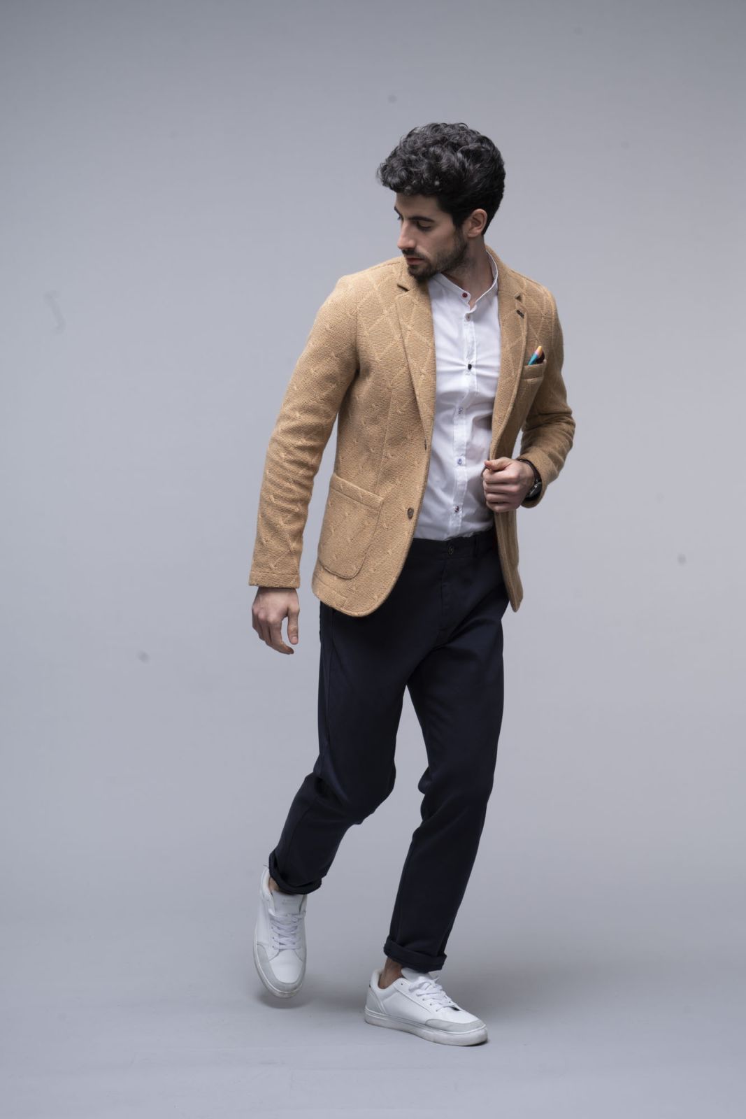 Giacca in lana, tessuto accoppiato, colore beige, due tasche, taschino, spilla KOON. 100% Made in Italy.
