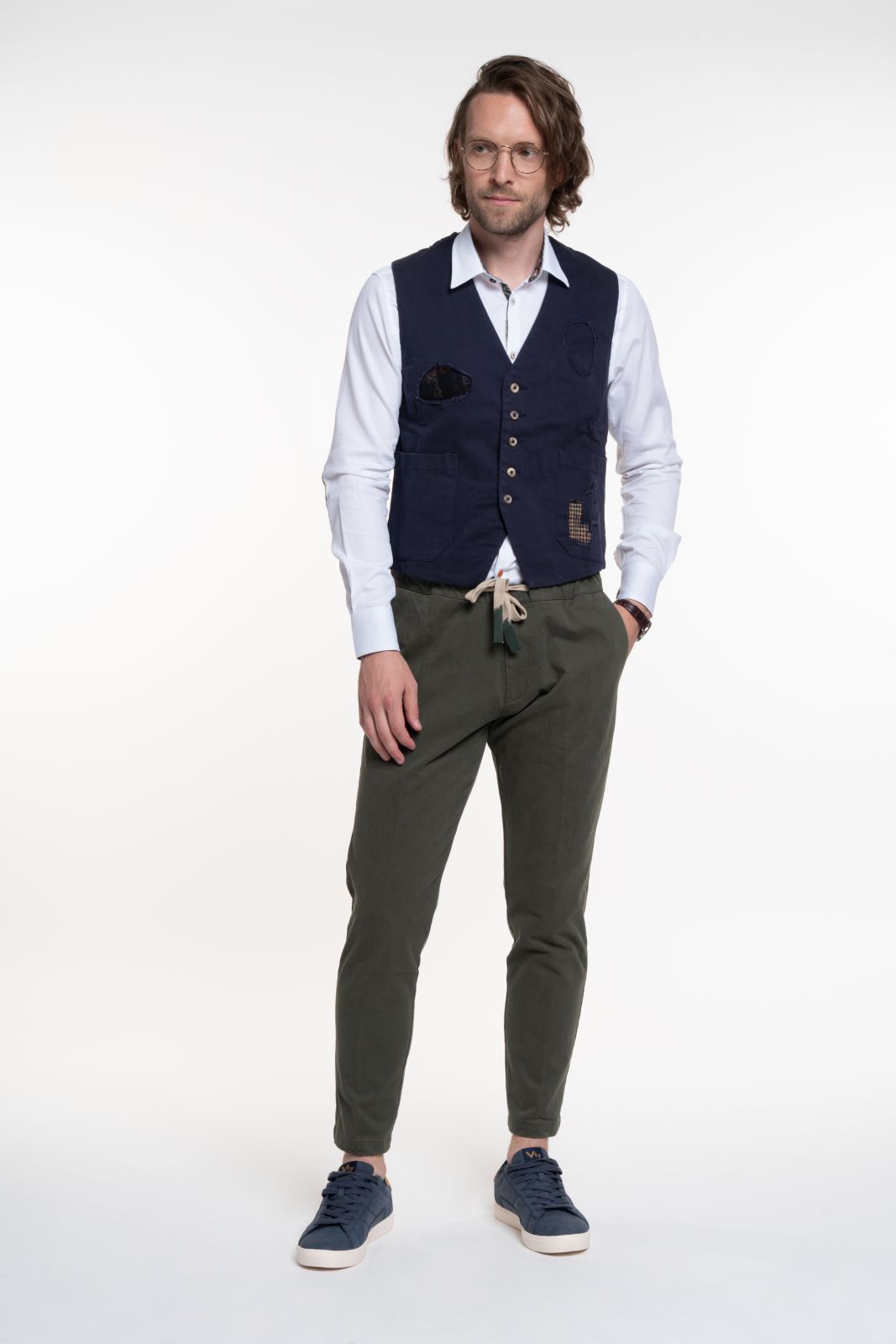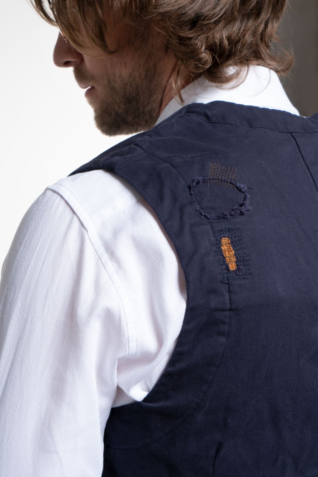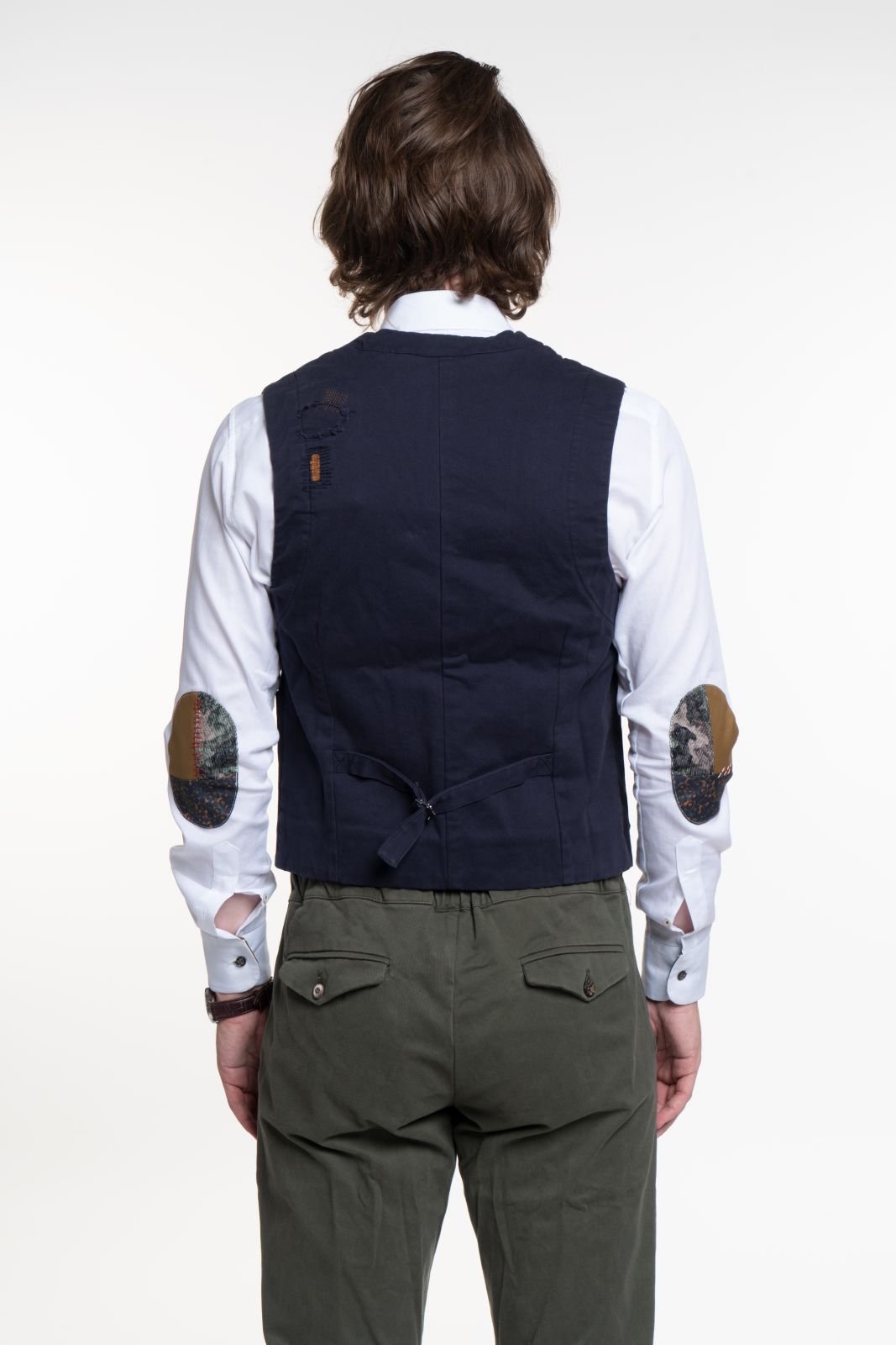 Gilet in cotone, composizione 98%CO 2%EA, rotture, ricami e intarsi in tessuti diversi, 2 tasche a toppa, tasche con rotture e intarsi in tessuto, fodera interna, fodera stampa fiore originale KOON