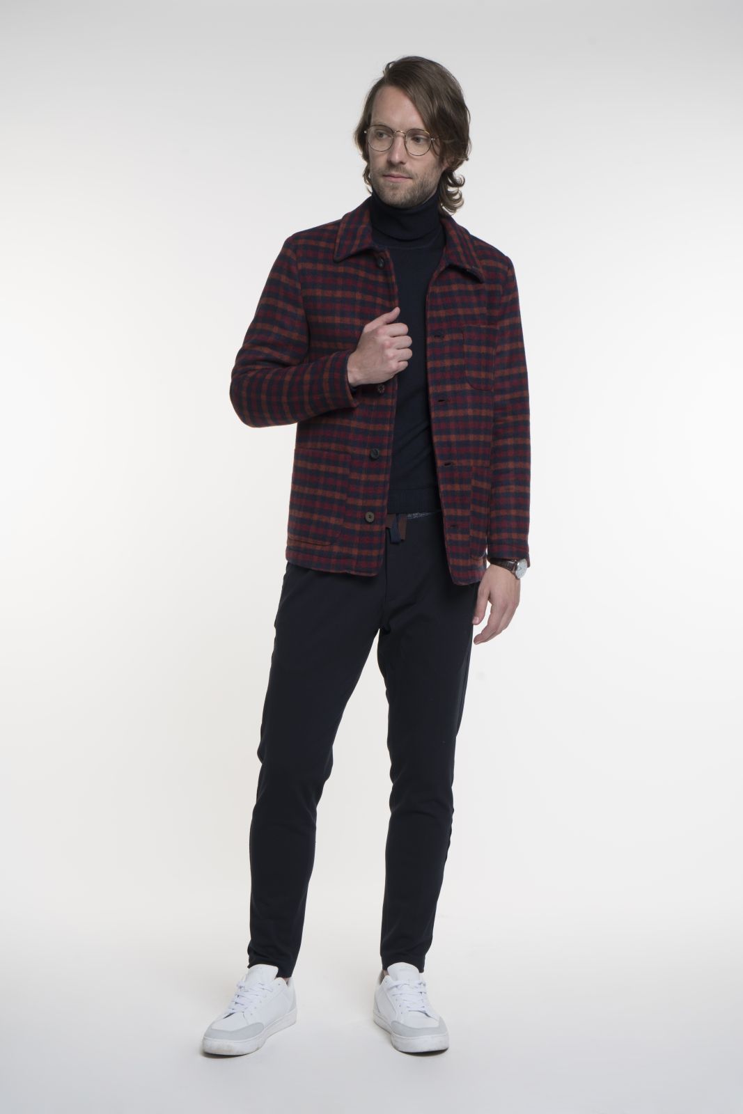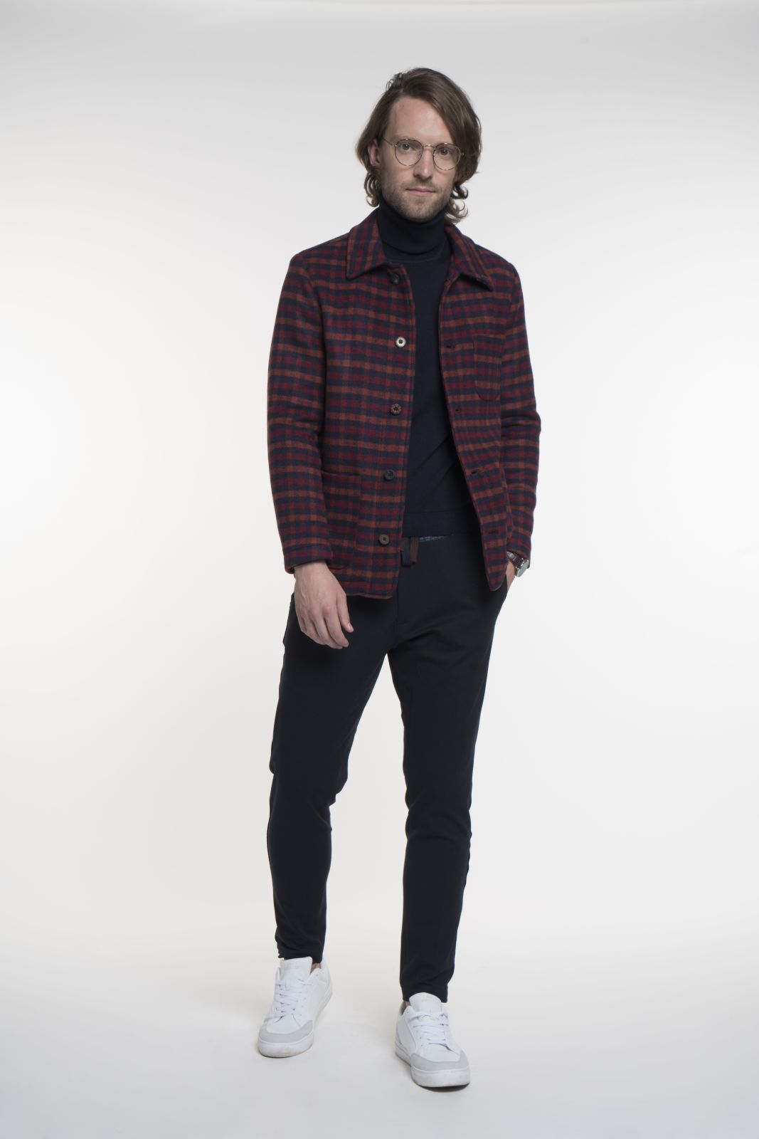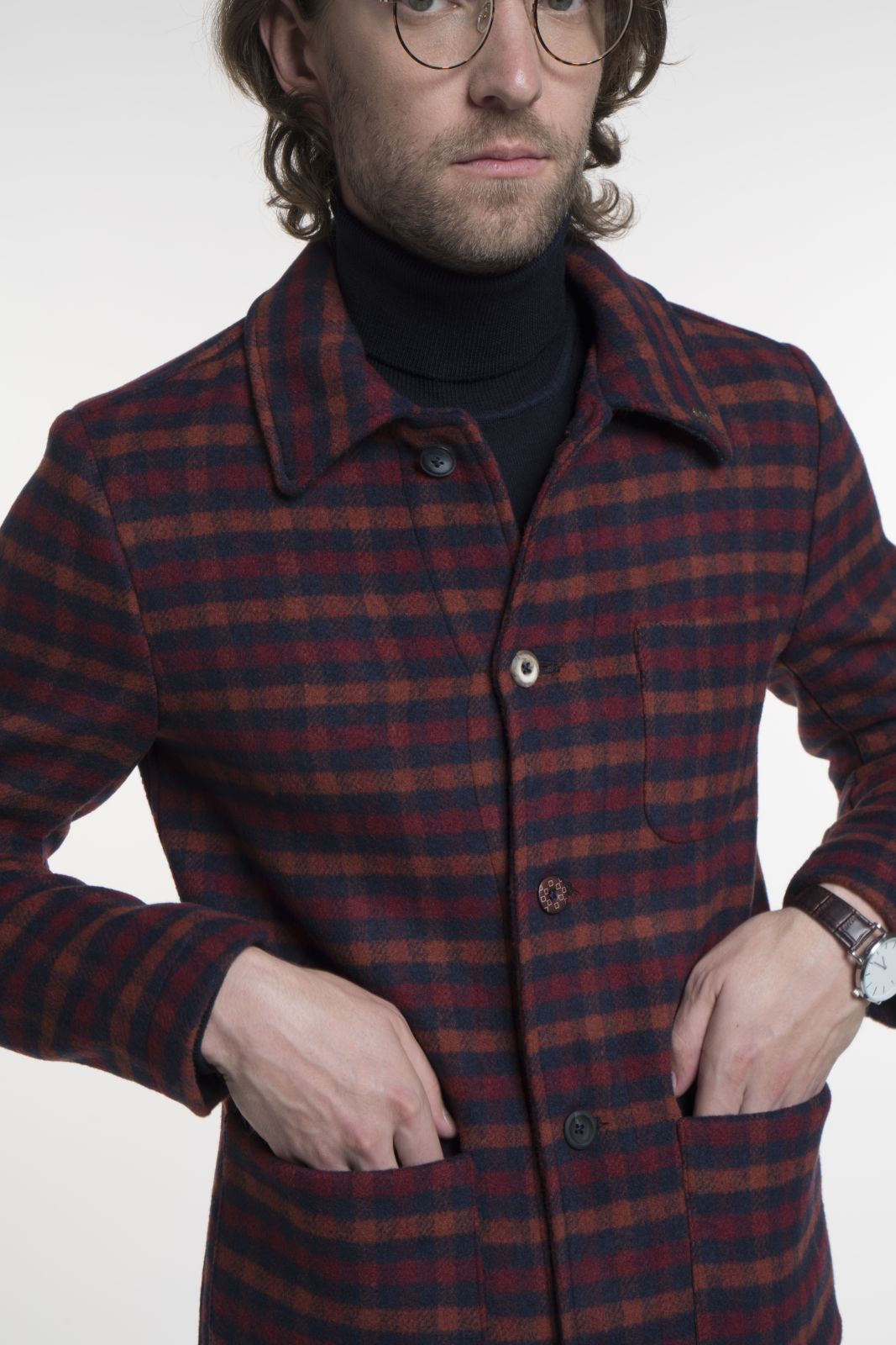 Giubbino quadro, composizione 50%PC 25%PL 20%WO 5%AF, quadro blu, ruggine, bordò, bottoni multicolor, tasca bassa a toppa, taschino alto a toppa, taschino interno, tessuto accoppiato