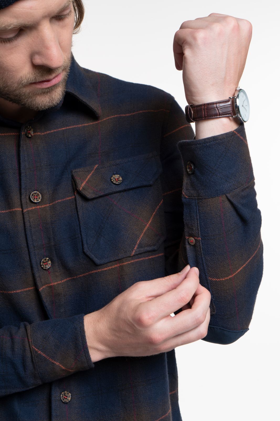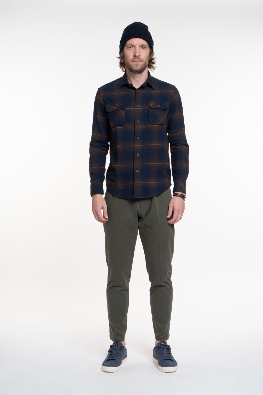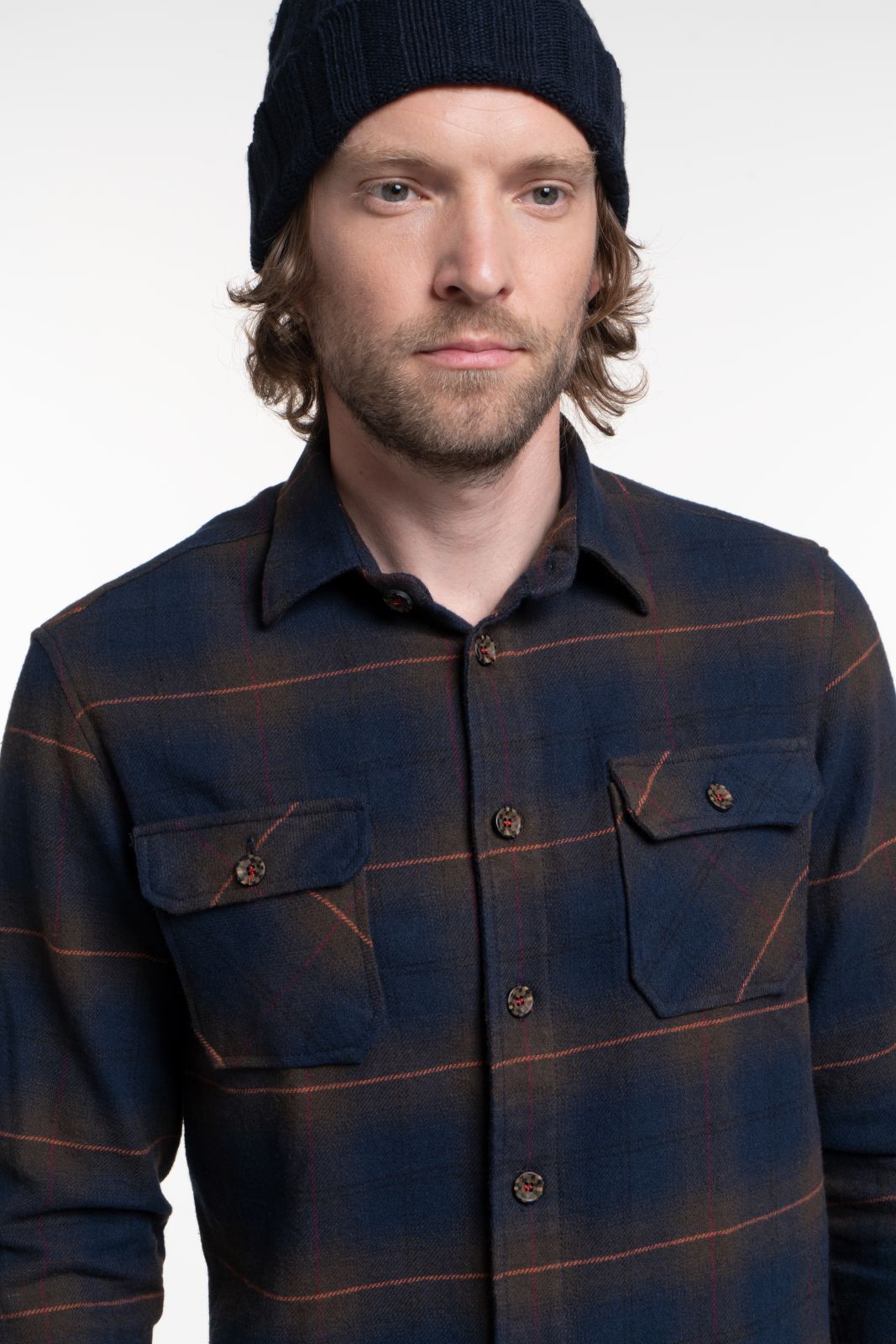 Overshirt quadro in flanella, composizione 70%CO 20%PC 10%AF, quadro blu, moro, arancio a contrasto, 2 tasche sul petto, tasche con bottoni, spallone e sottopolso gabardina moro, capo lavato