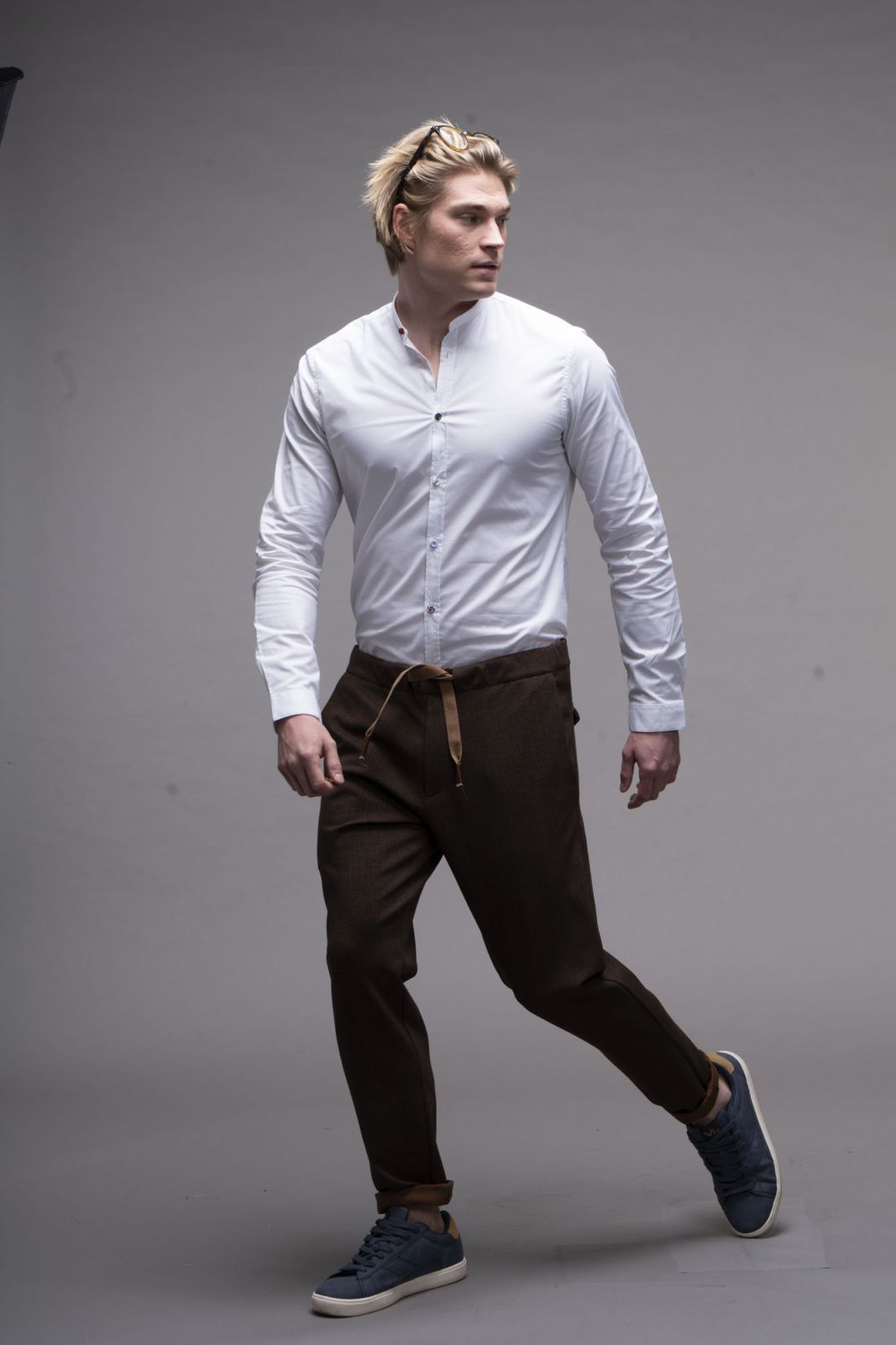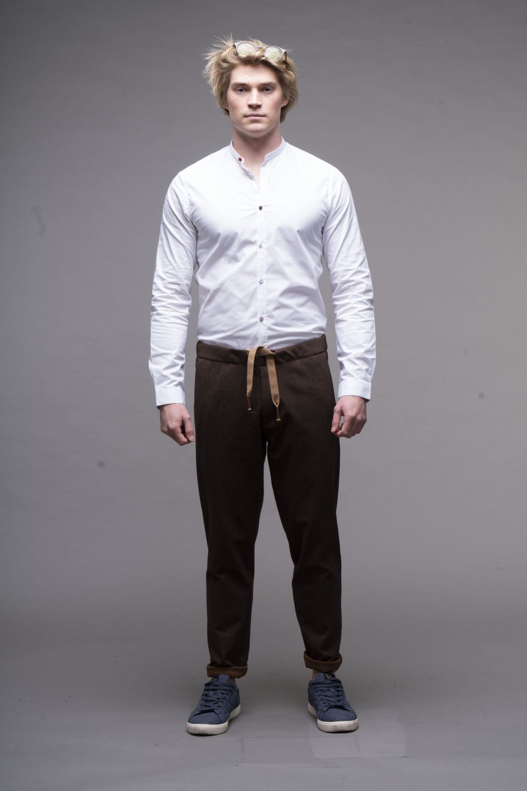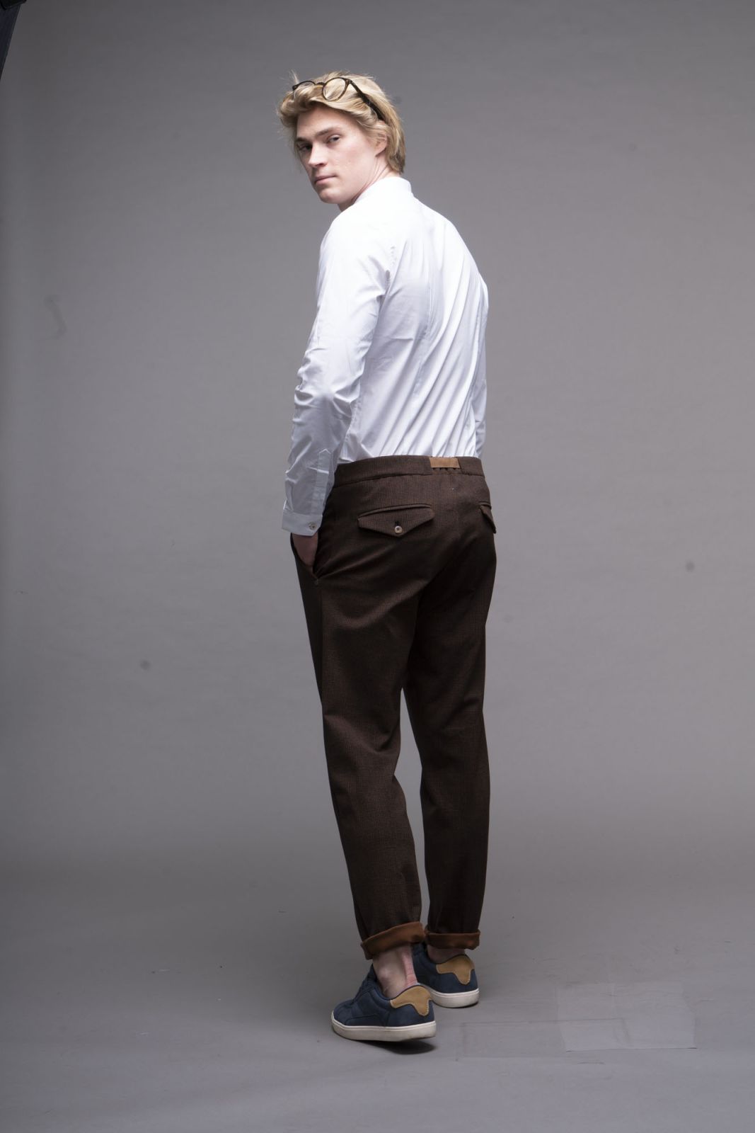 Pantalaccio in jersey stampato, composizione 65%VI 30%PA 5%EA, colore moro, coulisse beige ricamata a mano, 2 tasche posteriori a filetto con pattina. 100% Made in Italy.
