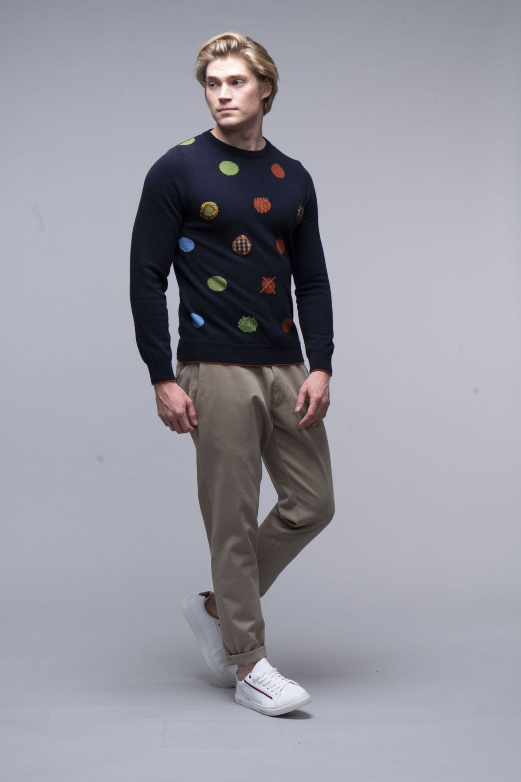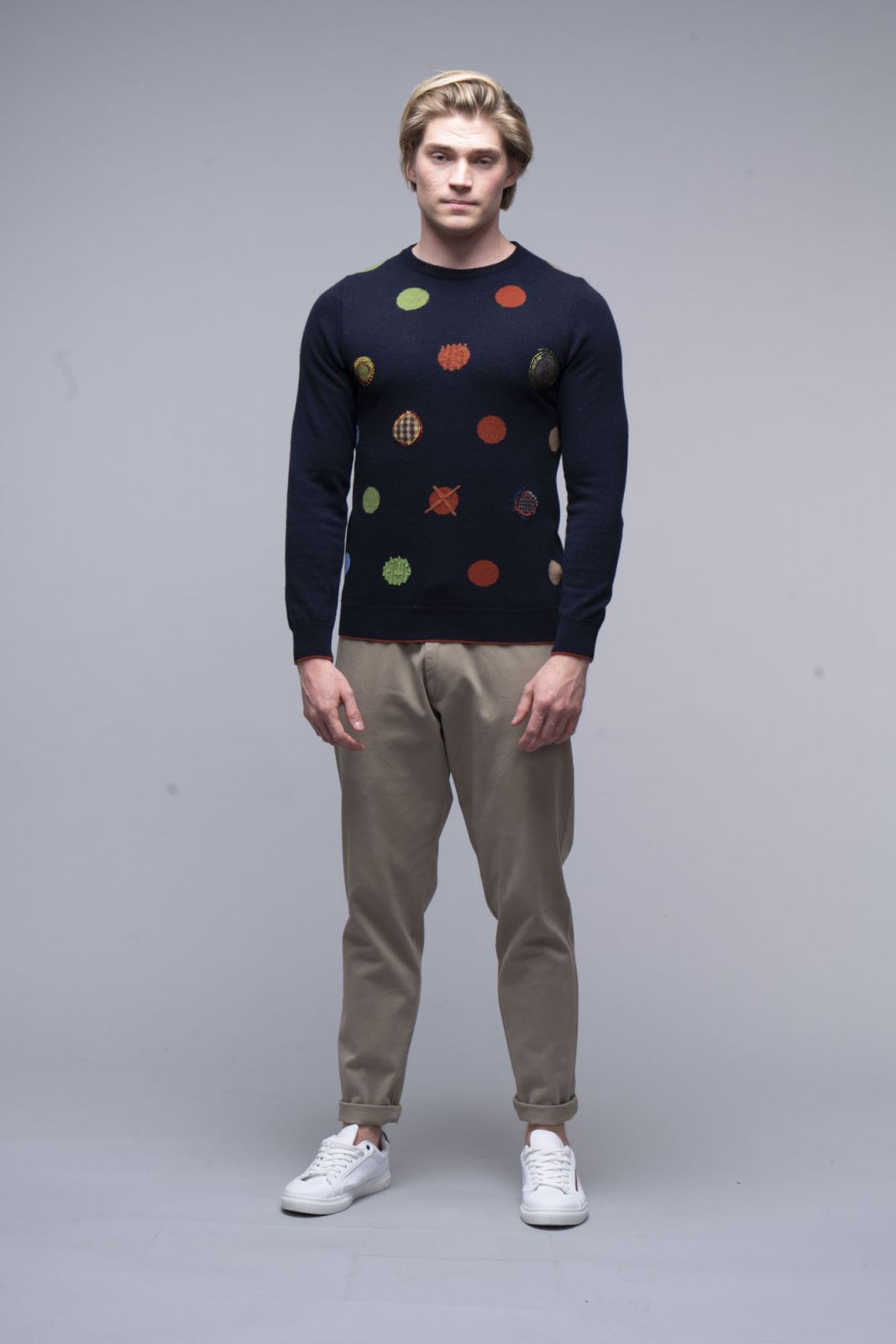 Maglia girocollo, finezza 12, pois multicolor a intarsio, ricami a mano, polsi a contrasto, balza a contrasto, lunetta originale KOON. 100% Made in Italy