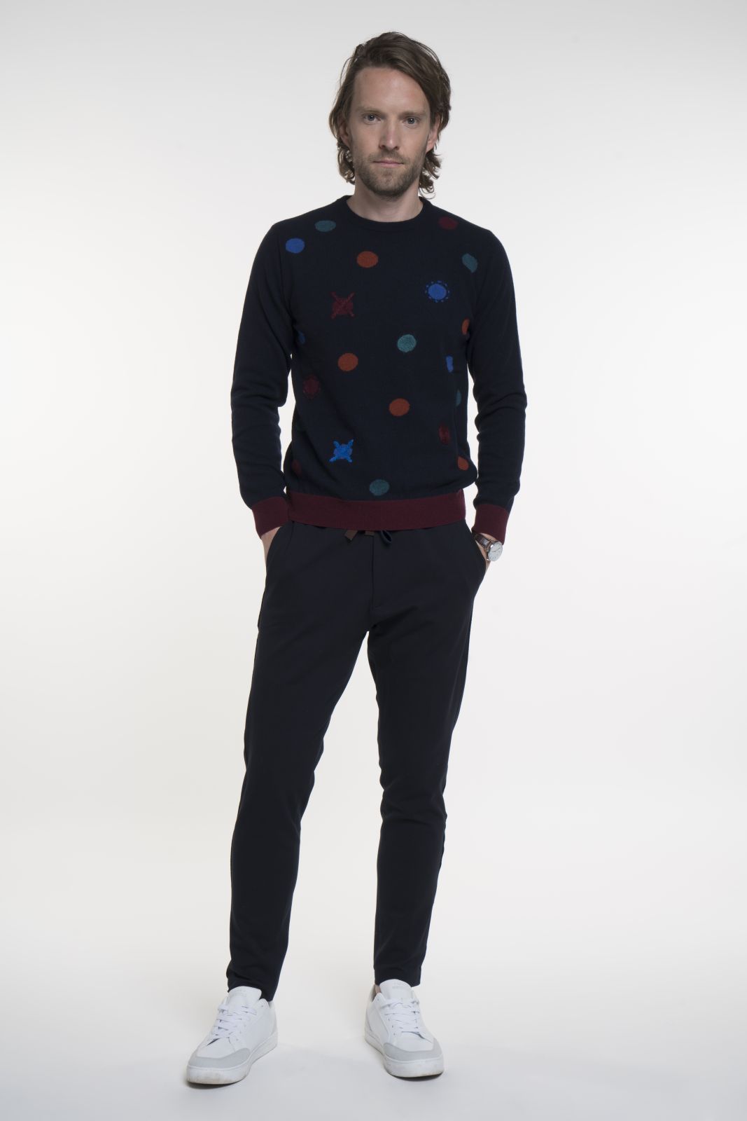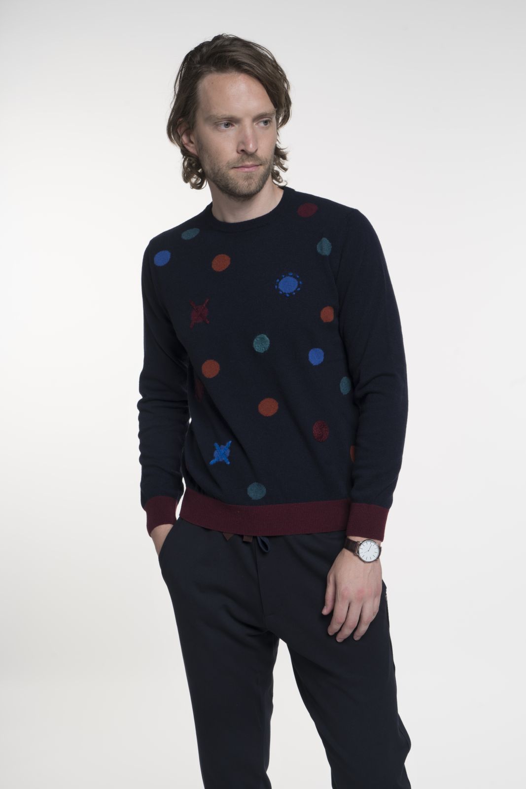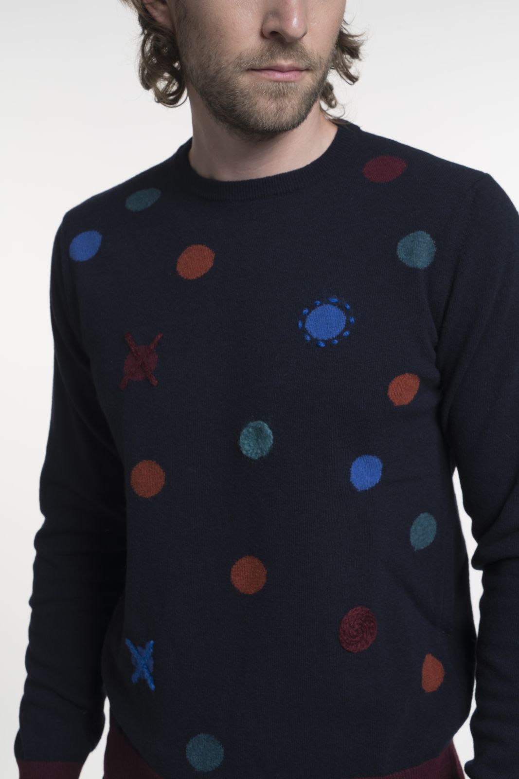 Maglia girocollo, composizione 80%WO 20%PA, finezza 7, colore blu, lambswool 80/20, pois multicolor a intarsio, ricami a mano, polsi a contrasto, balze a contrasto, lunetta originale KOON