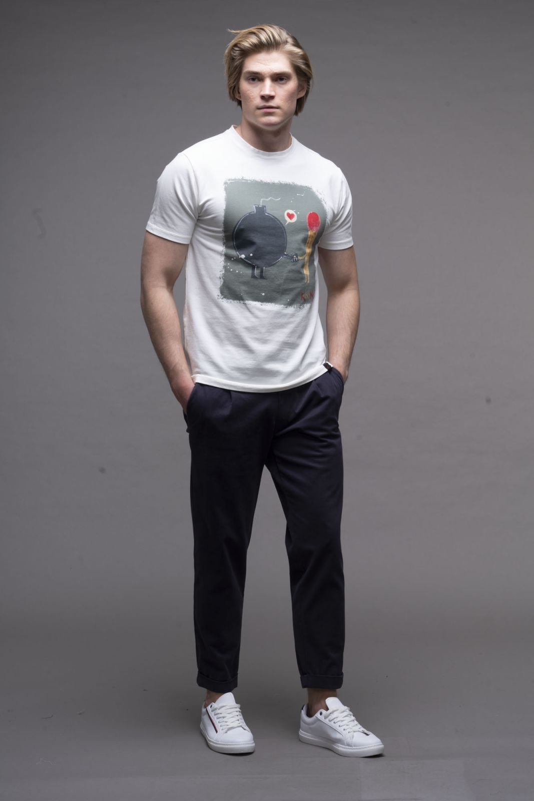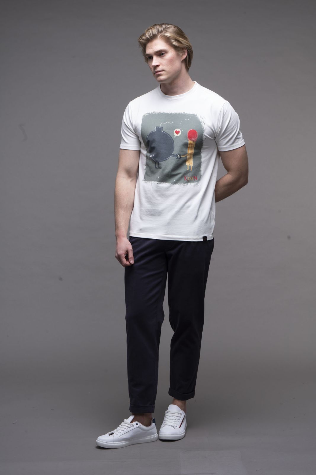 T-Shirt 100% cotone, colore bianco, stampata e dipinta a mano, moschina KOON. Personalizzazione artigianale che rende ogni capo KOON unico e inconfondibile. 100% Made in Italy.