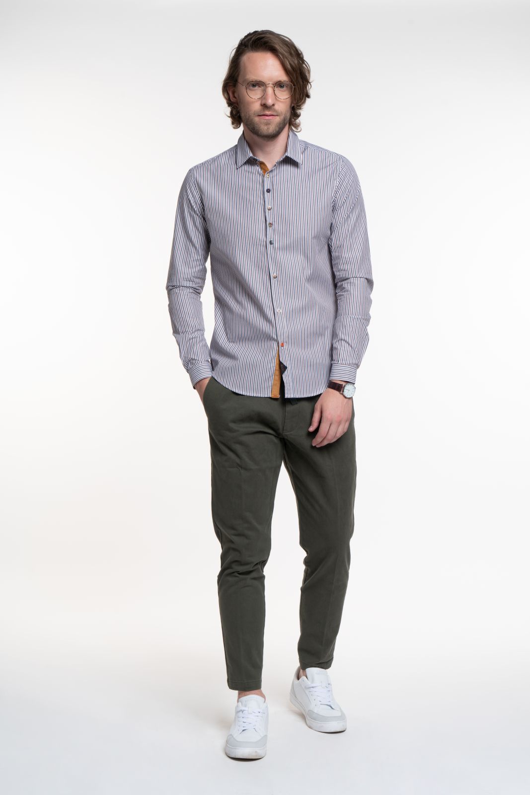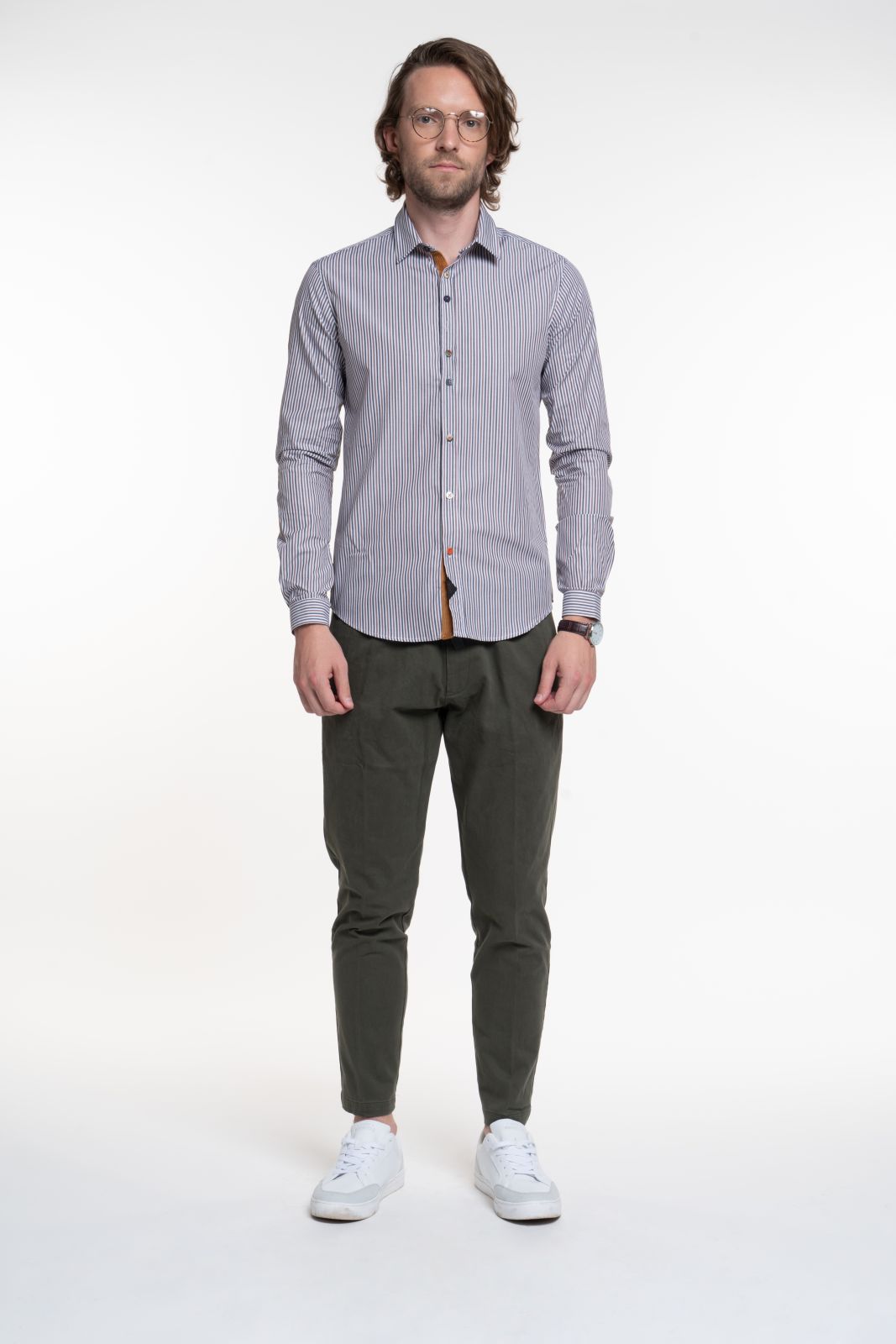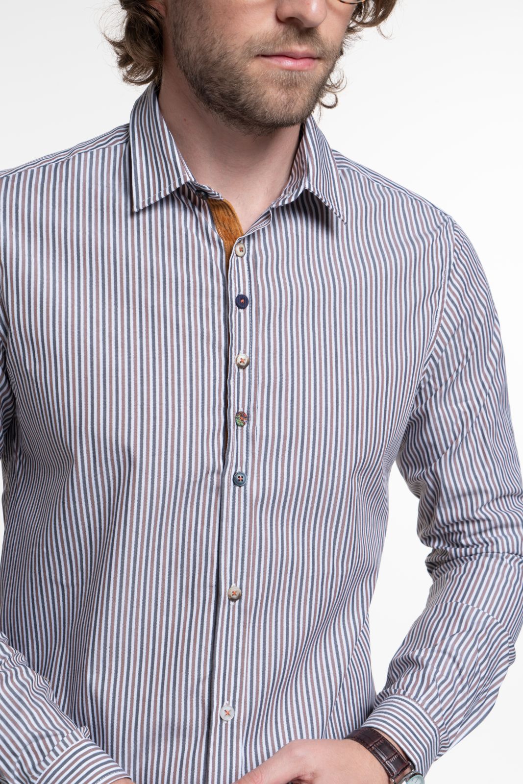 White shirt, 100% cotton, vertical grey and rust-coloured stripes, multi-coloured buttons (top 5 close together), velvet insert on placket, KOON fly on hip
