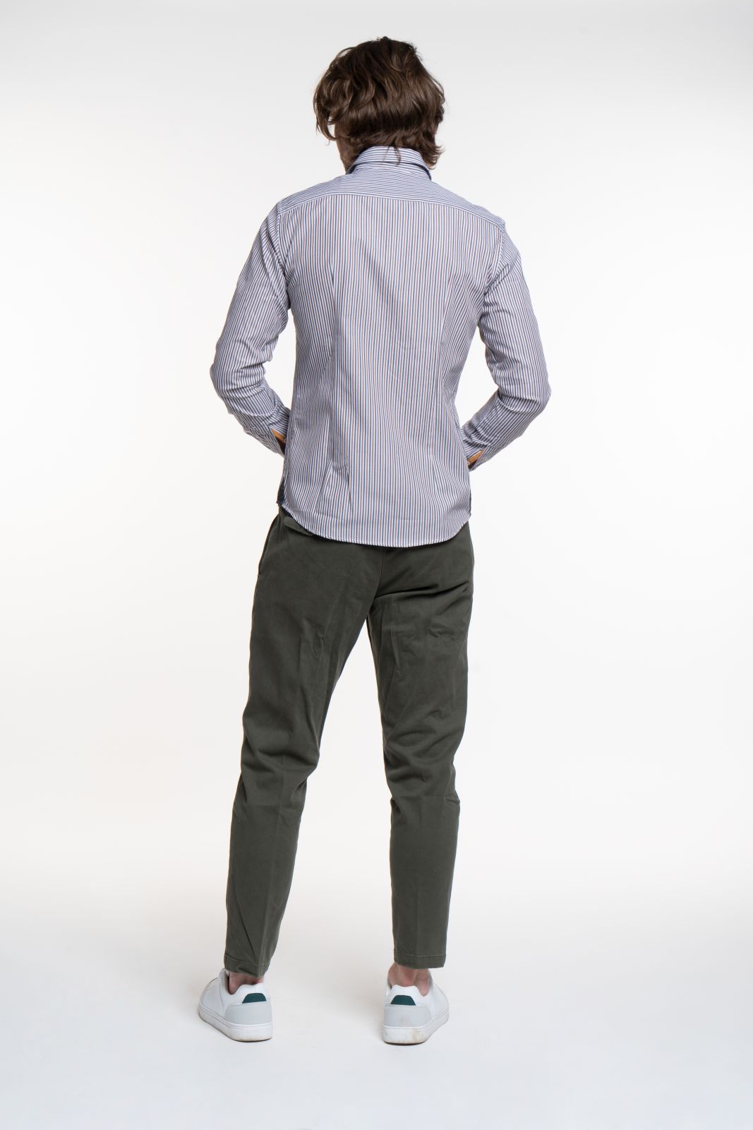 Camicia bianca, tessuto 100%cotone, righe verticali color ruggine e grigio, bottoni multicolor (primi 5 in alto ravvicinati), inserto in velluto sul cannoncino, mosca KOON sul fianco