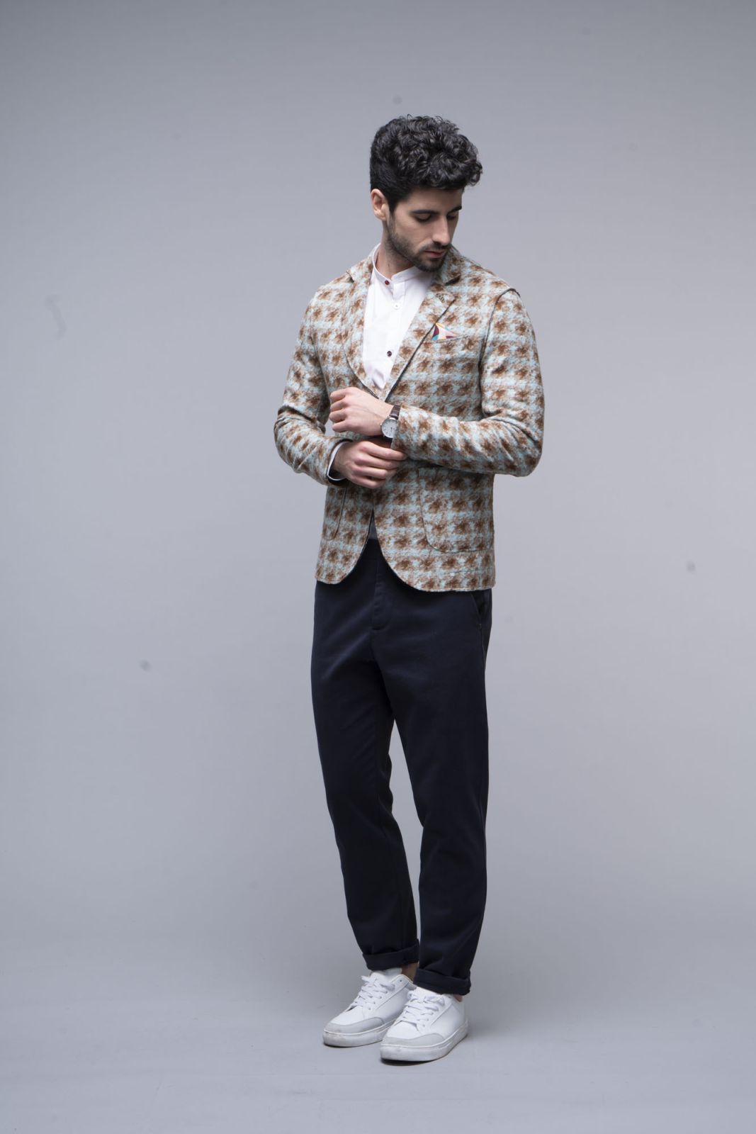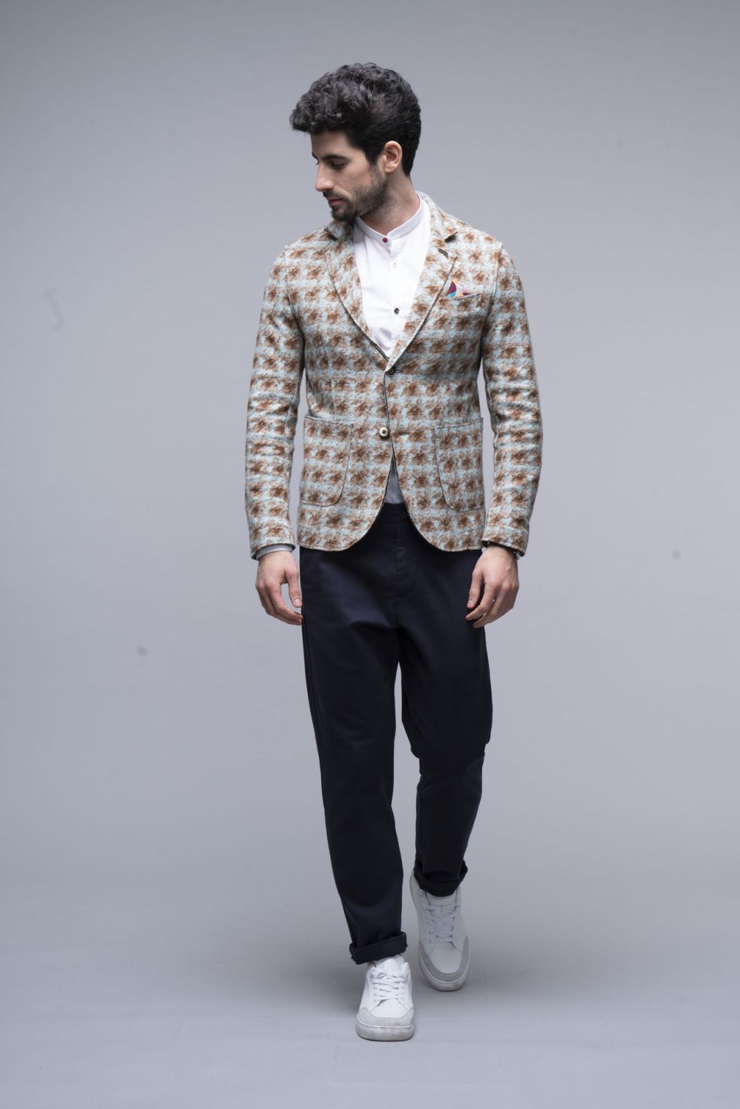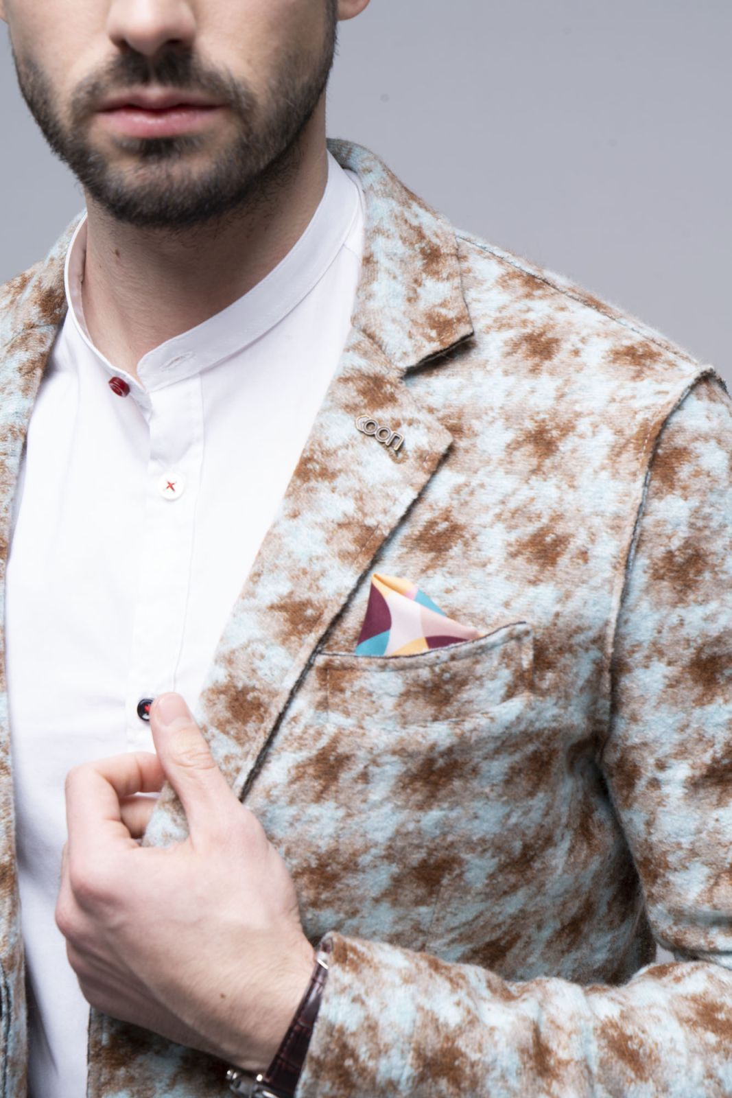 Giacca in lana cotta, tessuto pied de poule, taglio vivo, due tasche, taschino, spilla KOON. 100% Made in Italy.